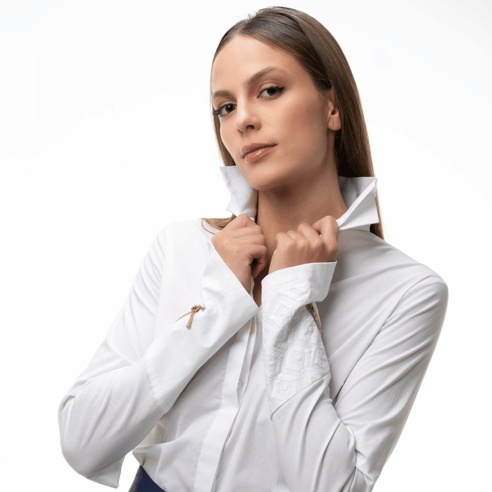 La silueta de la camisa es clásica y favorecedora, con detalles cuidadosamente elaborados como drapeados en los puños y cuello.